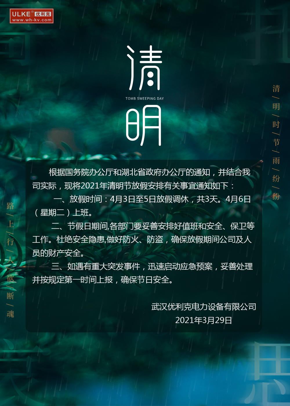 根據(jù)國務(wù)院辦公廳通知以及結(jié)合公司實際情況,公司現(xiàn)將2021年清明節(jié)放假安排通知如下:
