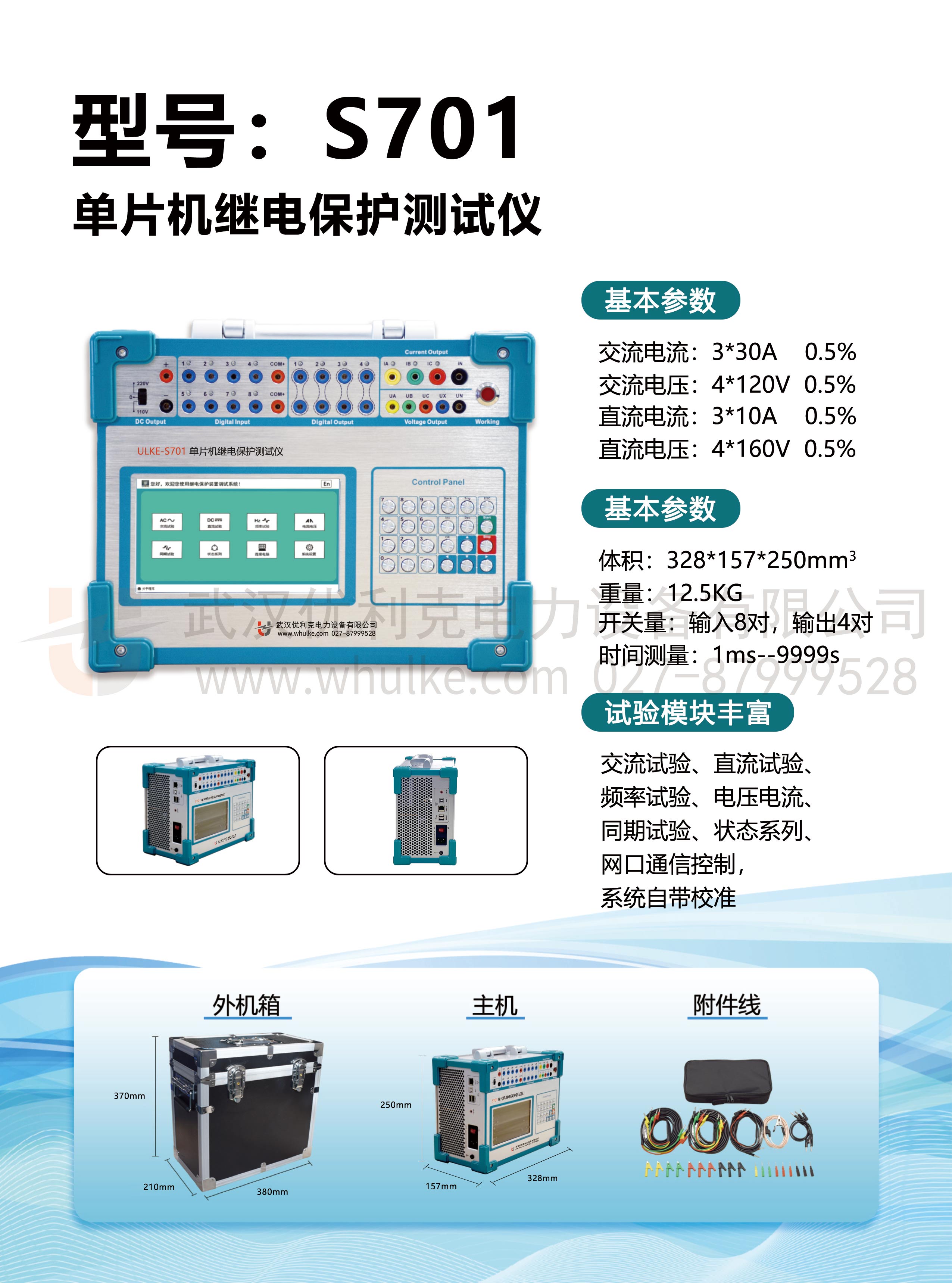 • ULKE - S701:主打高性價比,具備豐富的測試功能與友好的人機交互界面。支持多種保護類型測試,如過流保護、零序保護