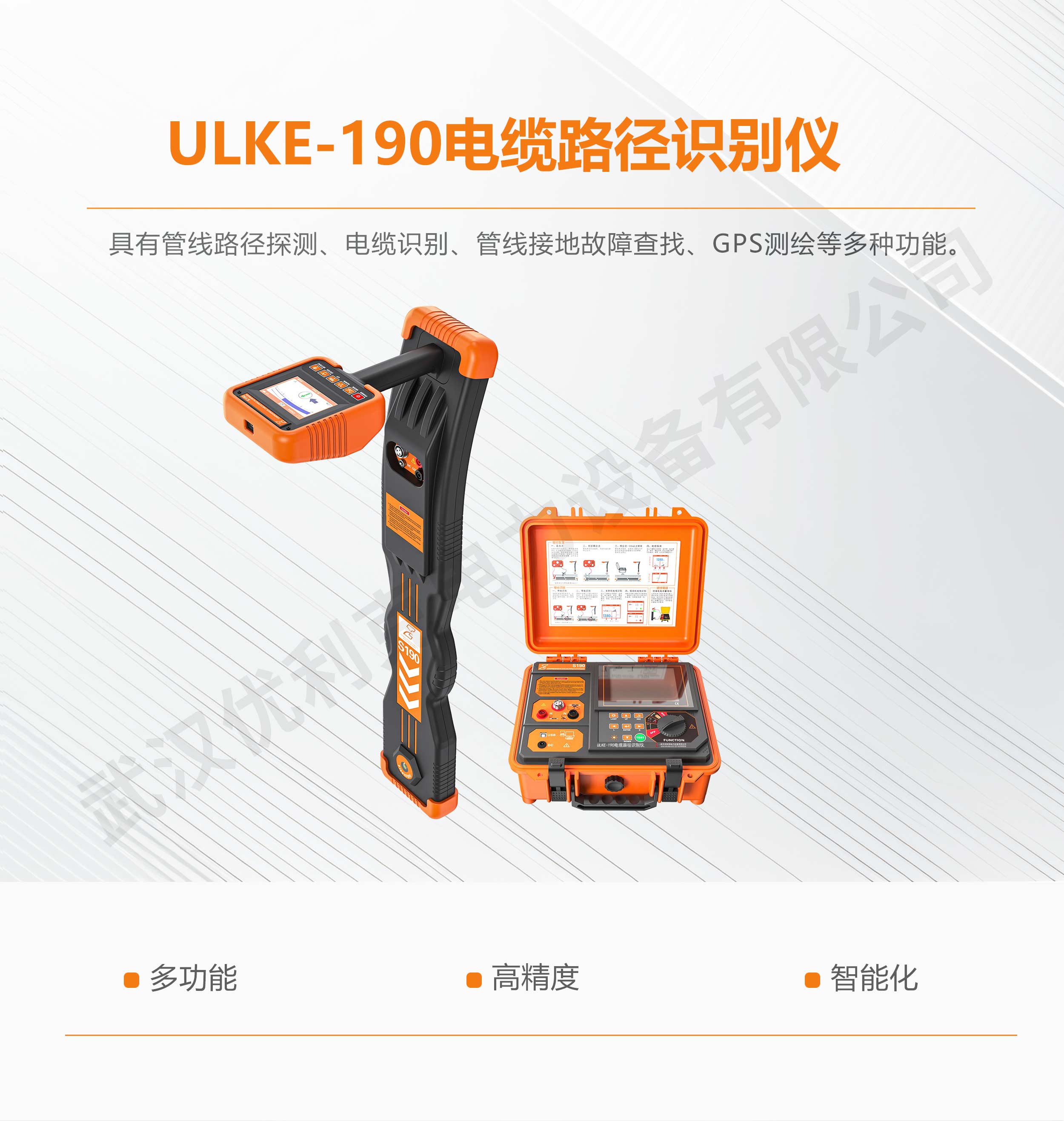 ULKE-190電纜路徑識別儀是一款綜合性能很強的路徑探測儀器。具有管線路徑探測、電纜識別、管線接地故障查找、GPS測繪等多種功能。儀器由發射機、發射電流鉗、接收機、接收柔性電流鉗、連接測試線、聽診器、A字架(選配件)、測繪APP(選配)、RTK(選配)等組成。