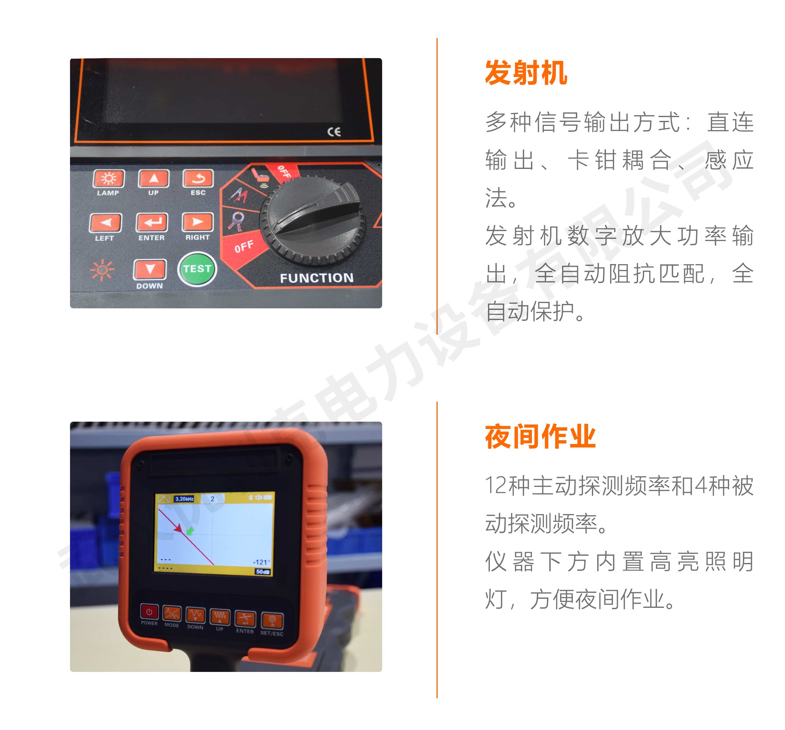 多種探測模式:經典定位模式,導線巡航模式,信號曲線模式。;儀器下方內置高亮照明燈,方便夜間作業。