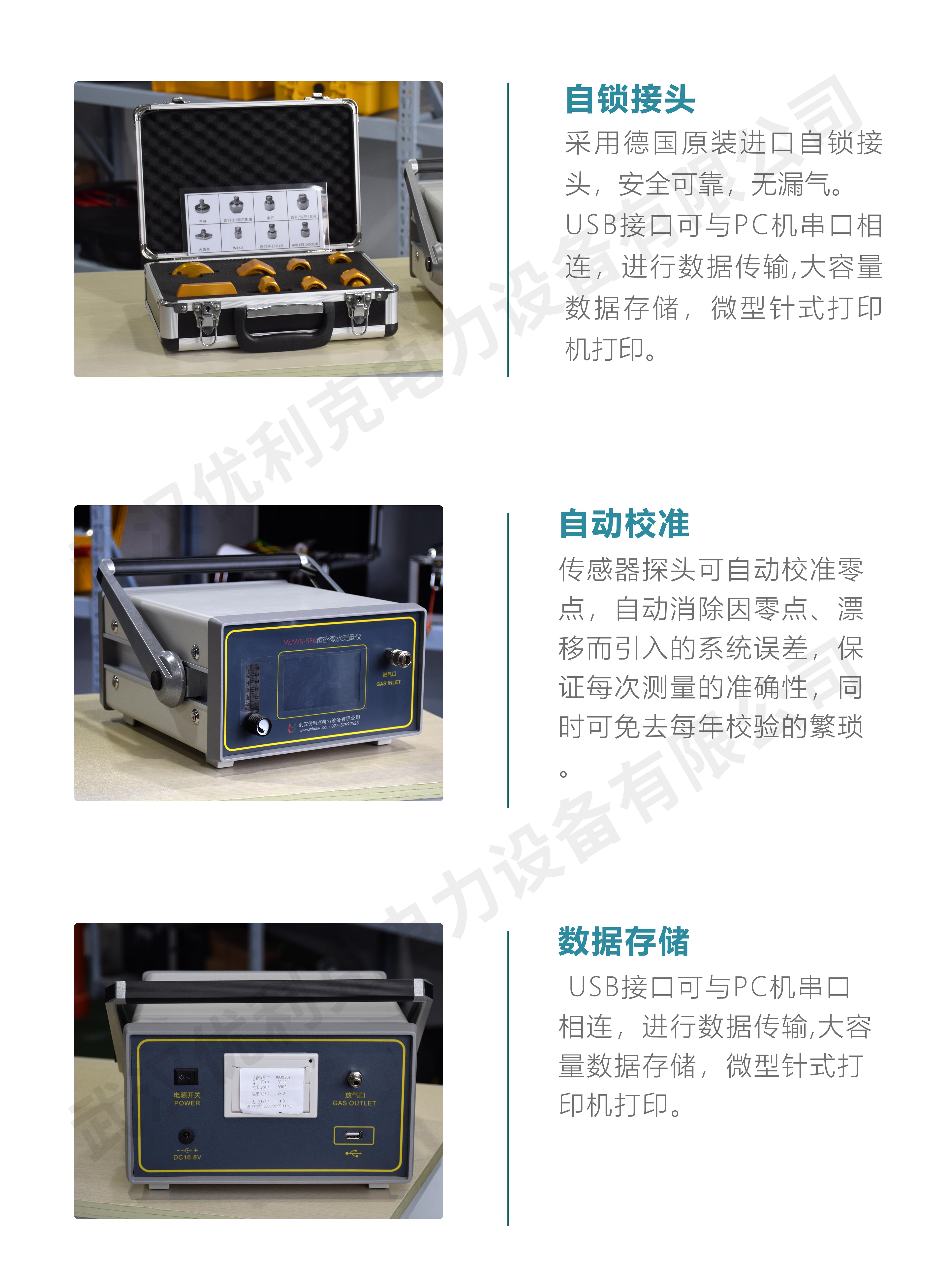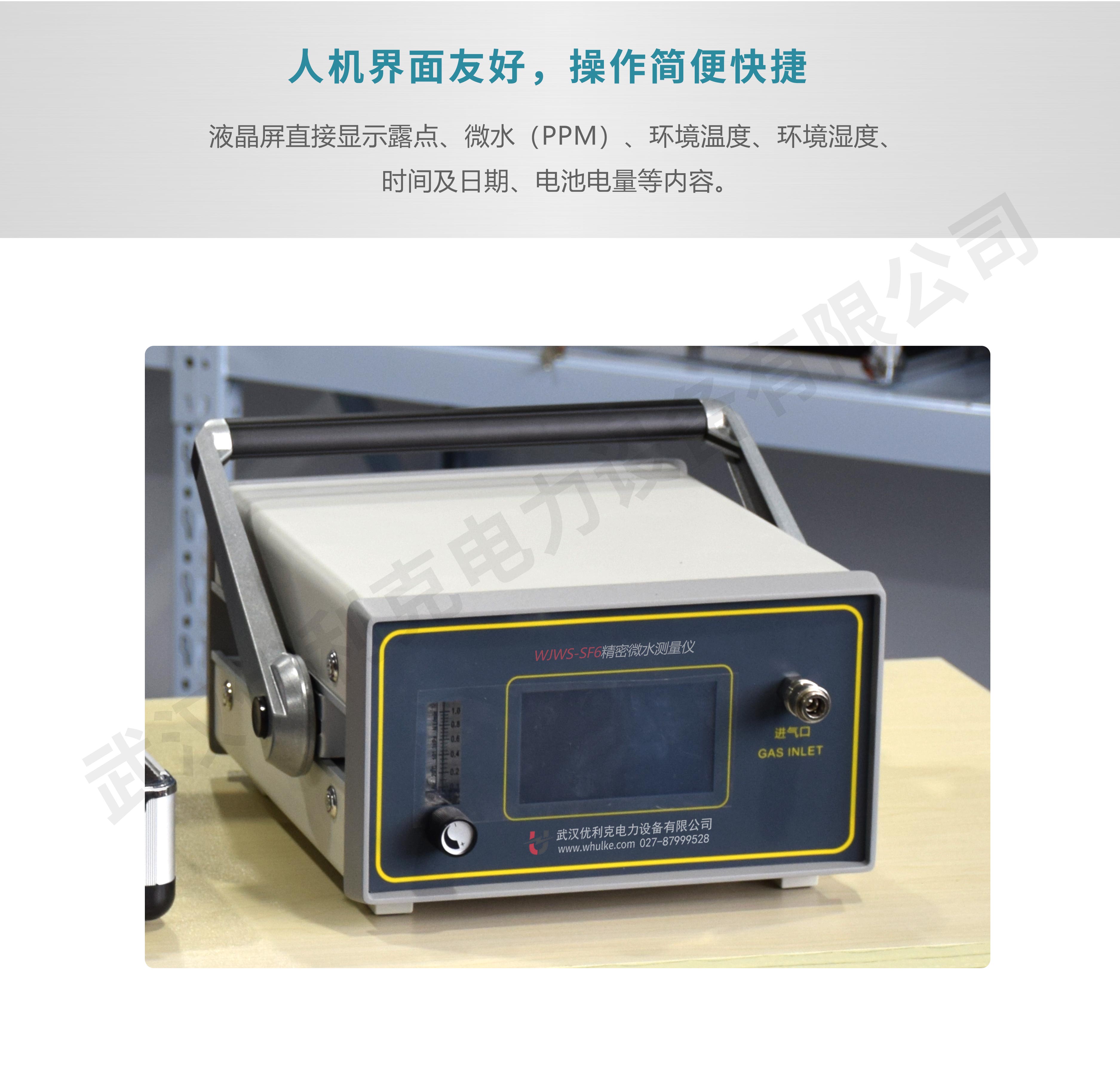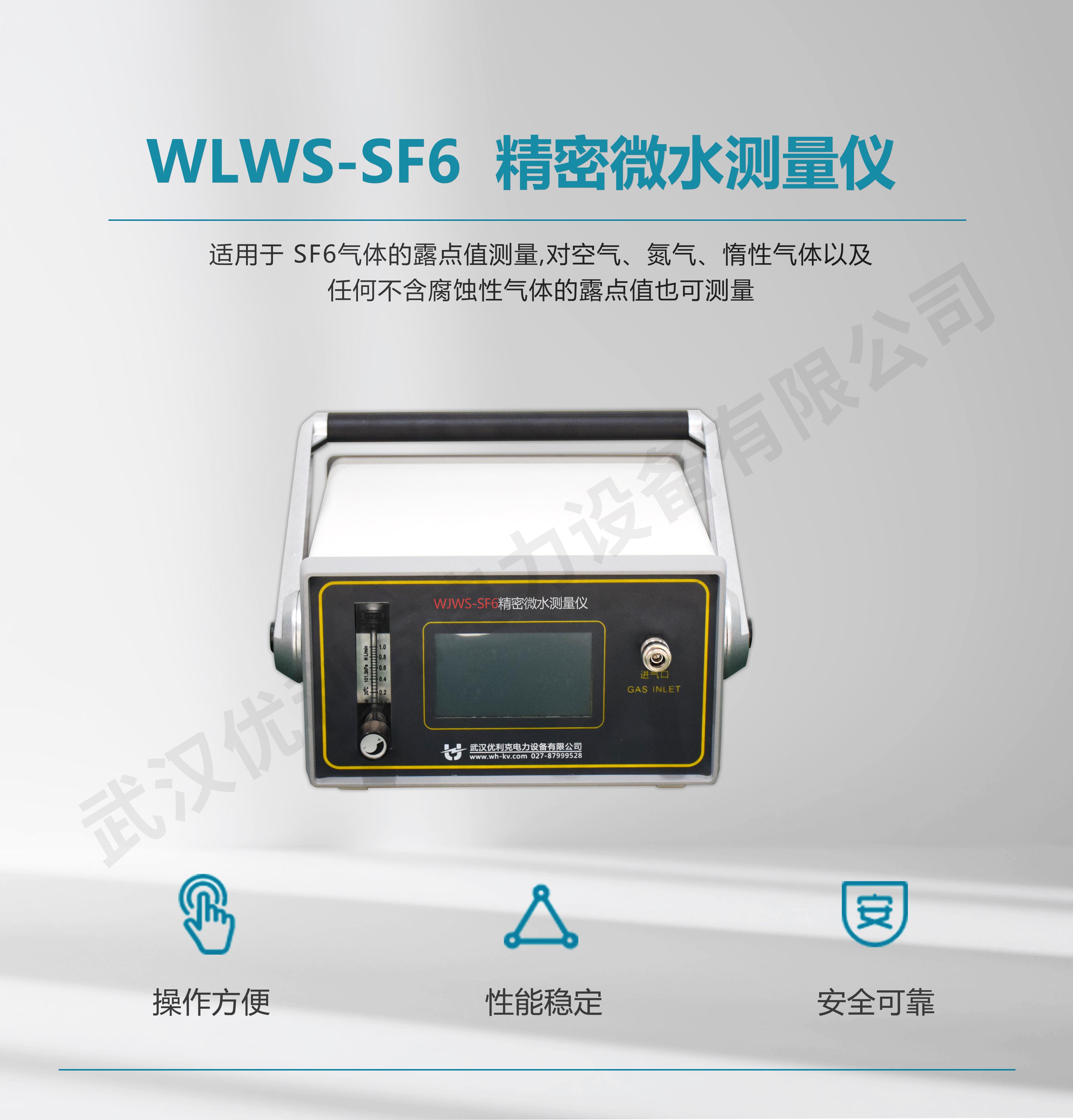 WLWS-SF6精密微水測量儀簡稱露點儀,是武漢優利克電力設備有限公司最新開發的現代化、高水平、智能型測量儀器。該儀器適用的領域非常廣泛,空氣、氮氣、惰性氣體以及任何不含腐蝕性介質的氣體的濕度測量,尤其適合于SF6氣體的濕度測量,電力、石化、冶金、環保、科研院所等部門均可采用,有著極高的性價比,特別是采用了歐洲標準技術,確保數據準確可靠。