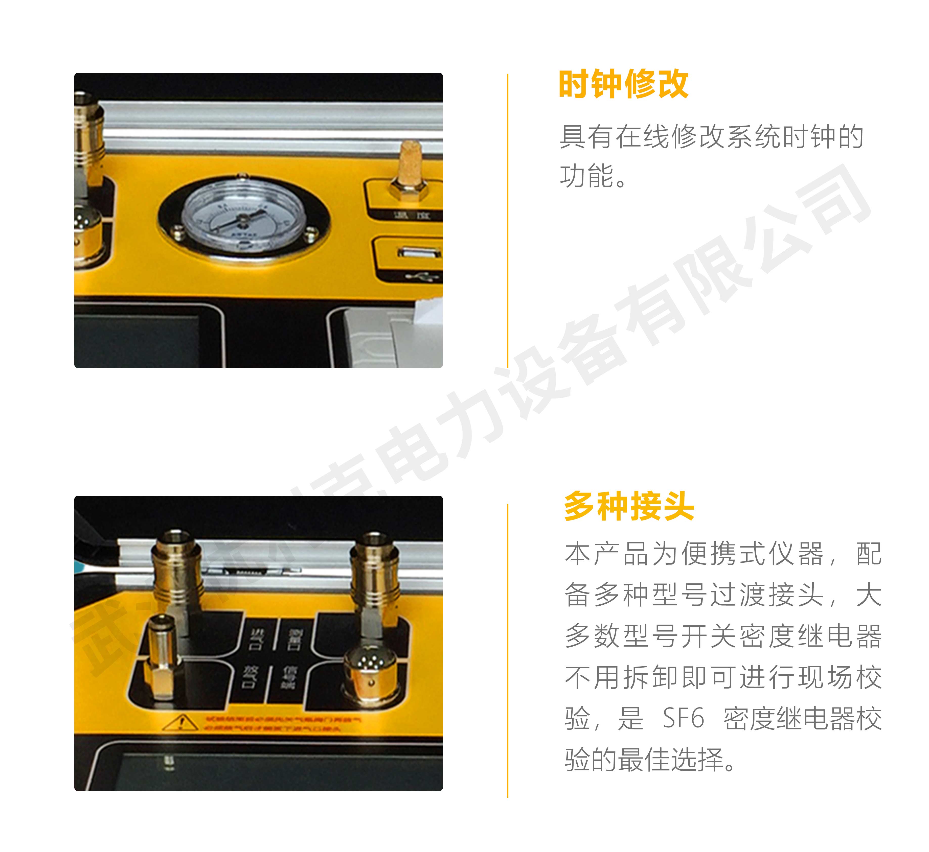 5、配套過渡接頭全:本產(chǎn)品為便攜式儀器,配備多種型號(hào)過渡接頭,大多數(shù)型號(hào)開關(guān)密度繼電器不用拆卸即可進(jìn)行現(xiàn)場(chǎng)校驗(yàn),是 SF6 密度繼電器校驗(yàn)的最佳選擇。
