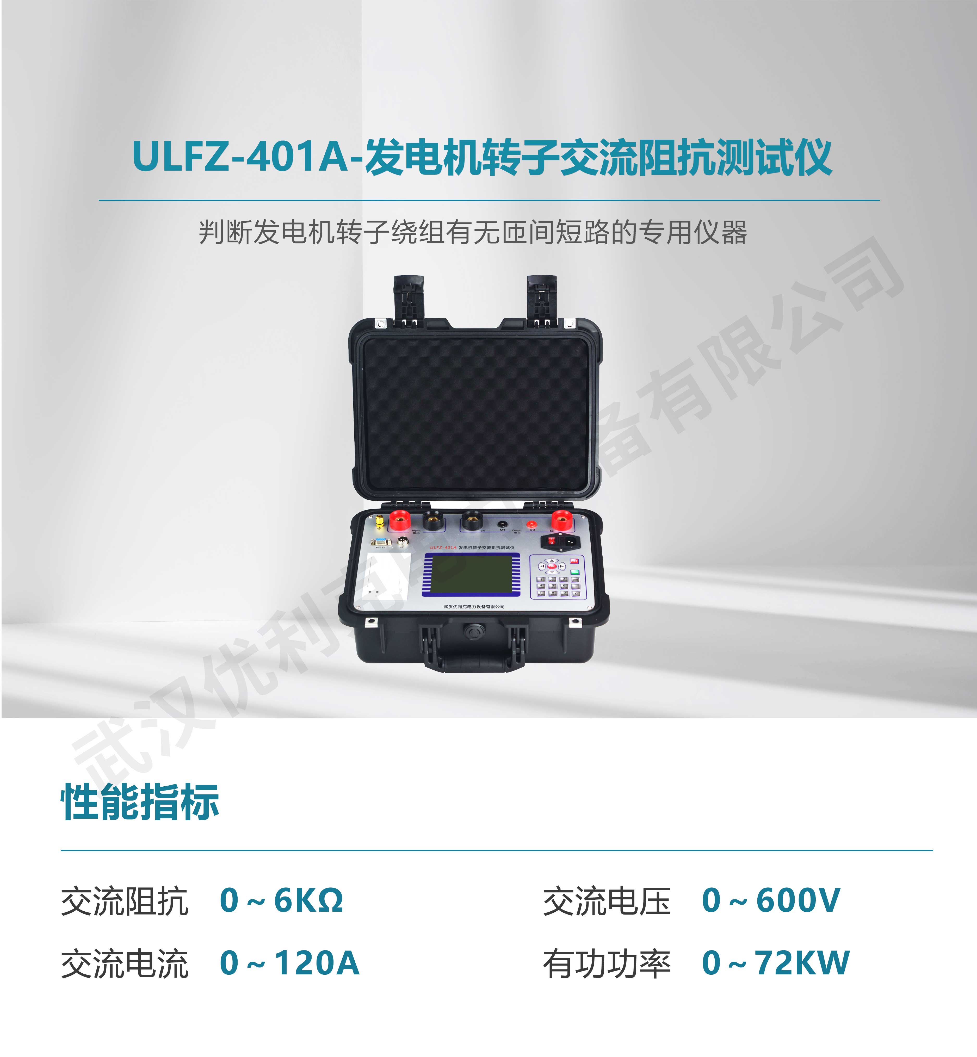 ULFZ-401A 發電機轉子交流阻抗測試儀是判斷發電機轉子繞組有無匝間短路的專用儀器,可以全自動、手動(單向或雙向)測量轉子繞組的電壓、電流、阻抗、功率、轉速、相位角等參數。
