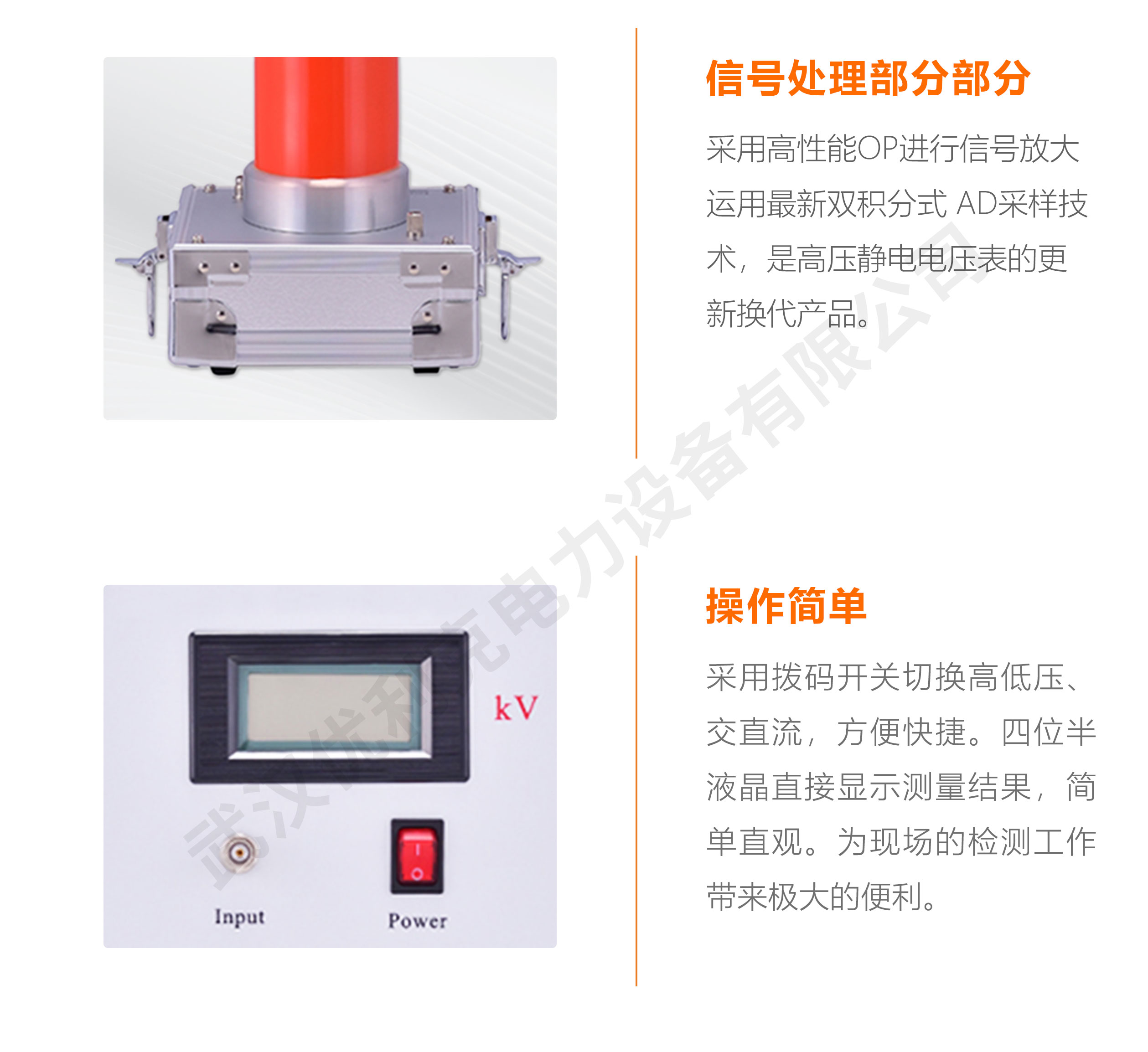 信號處理部分,采用高性能OP進行信號放大,運用最新雙積分式 AD采樣技術,四位半液晶顯示,最高分辨力達到0.001kV,是高壓靜電電壓表的更新換代產品。