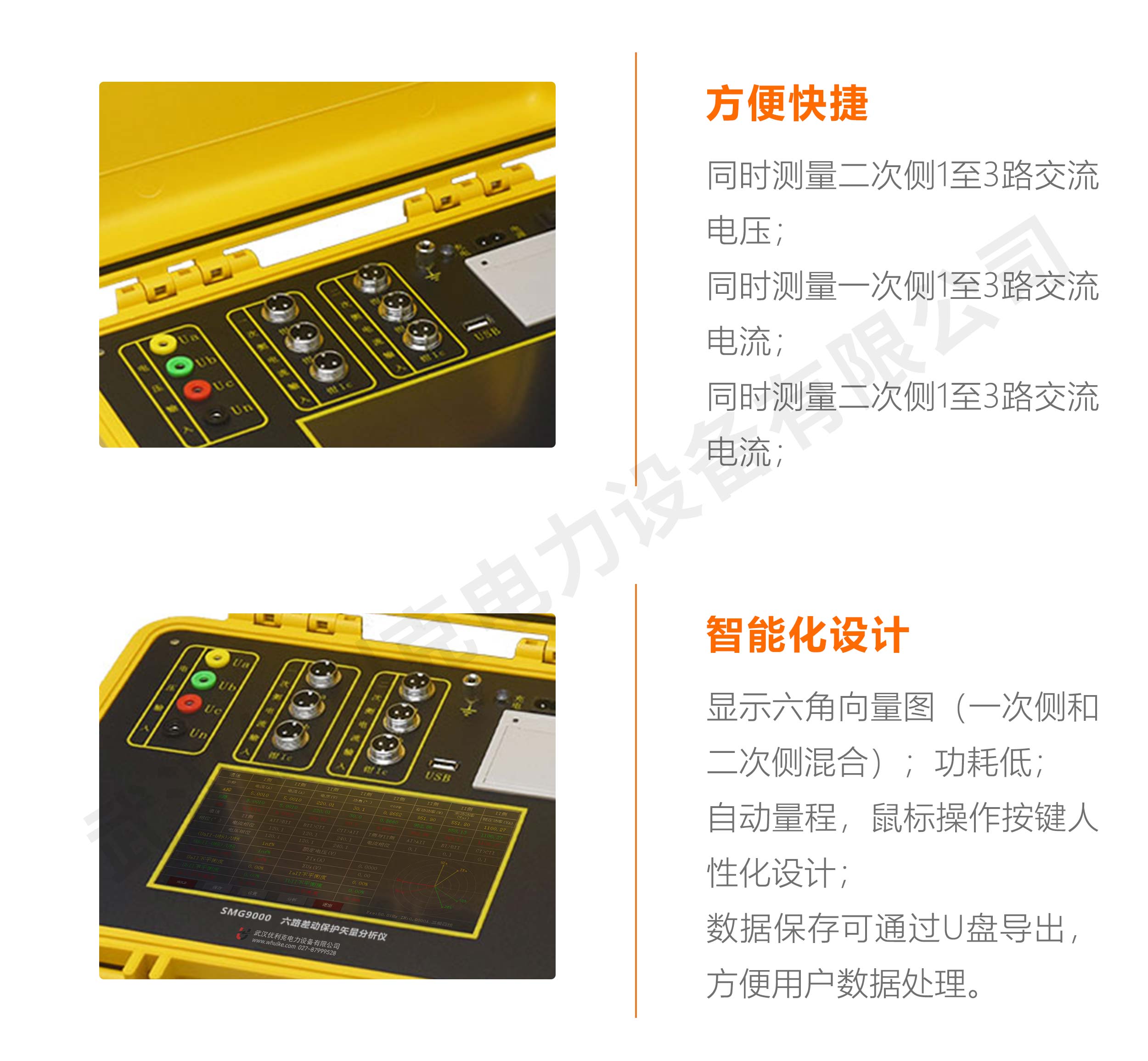 SMG9000六路差動保護矢量儀是一種可以同時測量一次側電流、二次側電流和二次側電壓既而做分析得出報告的儀器,儀器精確測量一次側電流、二次側電流和二次側電壓可以分析三相不平衡度和六角向量圖等,并可以輸出Word和Excel文件,無需上位機軟件,方便用戶后期處理報告。
